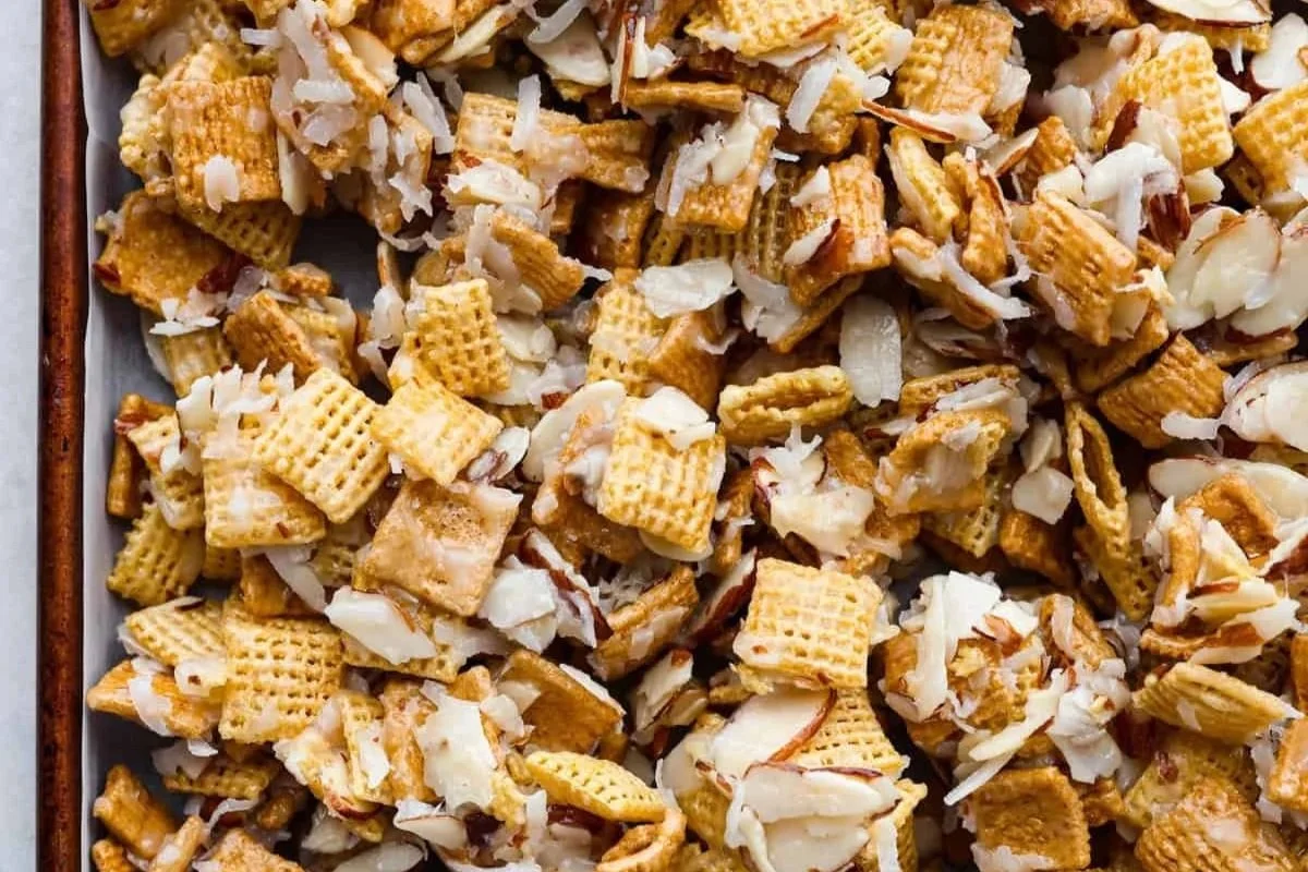 Mix in Corn Chex cereal and Golden Grahams cereal. Add coconut and slivered almonds. Give it all a nice stir.