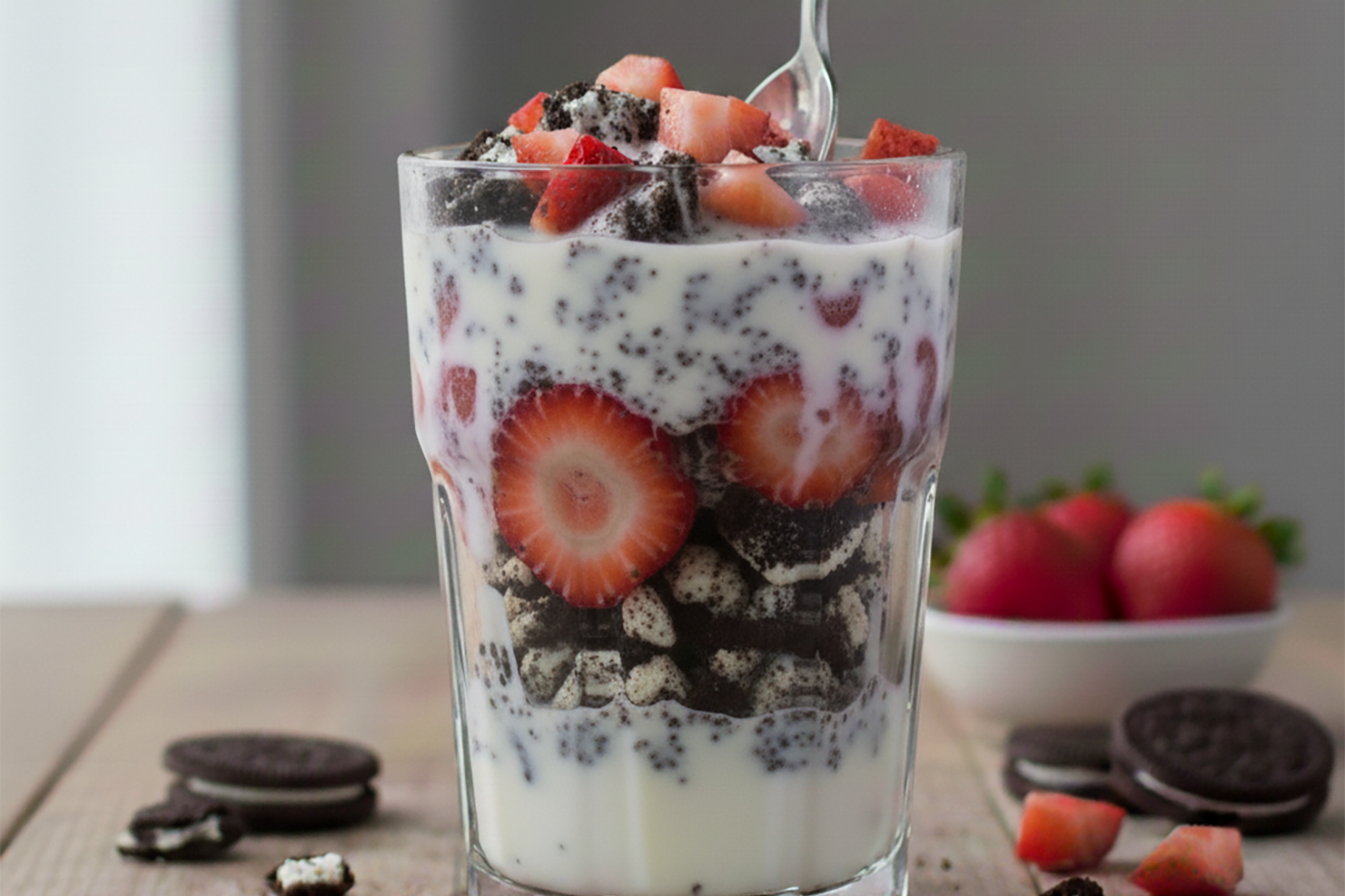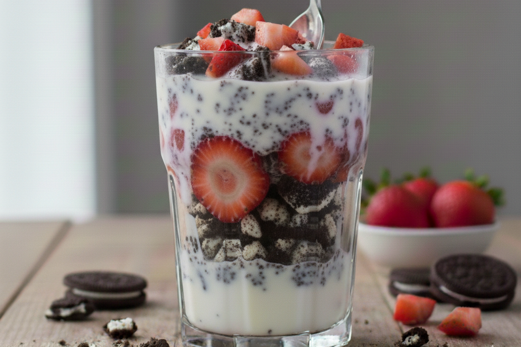 Place cookies and fruit in the bottom of an 8-12 oz glass. Pour milk on top.